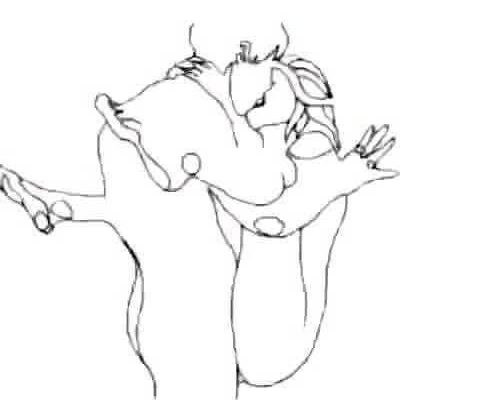 In the scene, the man is holding the woman close, lifting her slightly as they engage in a passionate kiss. The woman’s leg is wrapped around the man, emphasizing closeness and romance. The background is blurred, focusing on the couple and their connection, while the bed and dim lighting contribute to the intimate setting. The artistic style is impressionistic, with soft brushstrokes and blended colors, enhancing the emotional depth of the image.