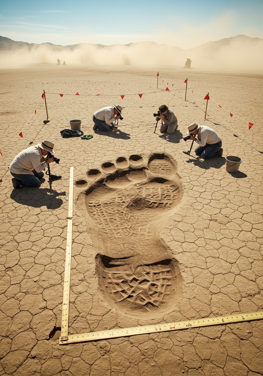 In a remote expanse of desert, archaeologists have stumbled upon a discovery that has left both scientists and the public astonished: a colossal footprint pressed into hardened earth, far larger than that of any known human or animal. The print, striking in its clarity and scale, has ignited heated debate—reviving age-old legends of giants while prompting skeptics to seek rational explanations.